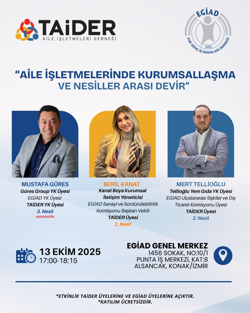 13 Ekim’de İzmir’de TAİDER ve EGİAD iş birliğinde “Aile İşletmelerinde Kurumsallaşma ve Nesiller Arası Devir” paneli gerçekleşti. Beril Kanat ve Mert Tellioğlu’nun deneyimlerini paylaştığı paneli Mustafa Güres yönetti.