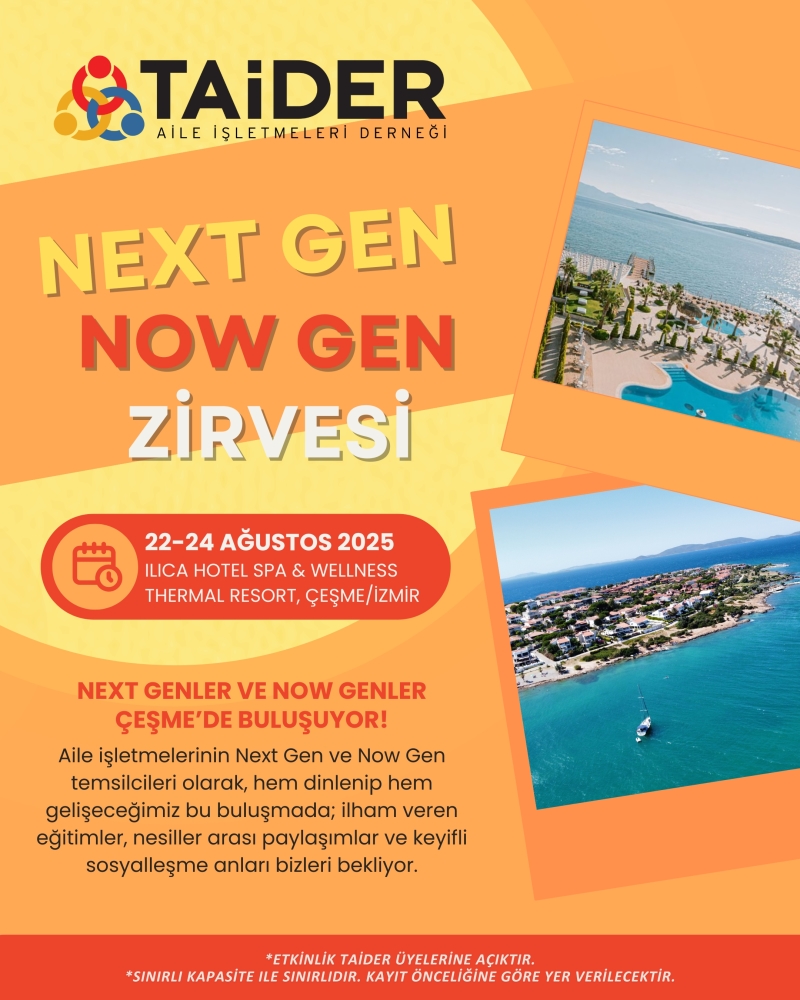 TAİDER olarak, aile işletmelerinin sürdürülebilirliğinde nesiller arası diyaloğun gücüne inanıyoruz. Bu doğrultuda, Next Gen ve Now Gen Topluluklarımızın iş birliğinde, farklı nesillerde üyelerimizin bir araya geleceği özel bir Zirve ile 22-24 Ağustos 2025 tarihlerinde Ilıca Hotel Spa & Wellness Thermal Resort Çeşme/İzmir’de buluşacağız!