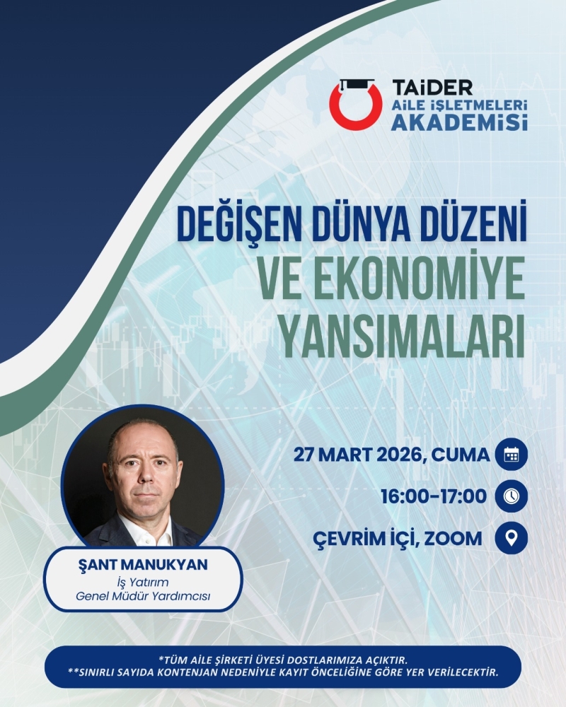 TAİDER Akademi Webinar serisinin 5. toplantısında "Değişen Dünya Düzeni ve Ekonomiye Yansımaları" konu başlığını İş Yatırım Genel Müdür Yardımcısı Şant Manukyan'dan dinlemek üzere 27 Mart 2026 Cuma günü saat 16:00–17:00 aralığında çevrim içi olarak bir araya geleceğiz.
