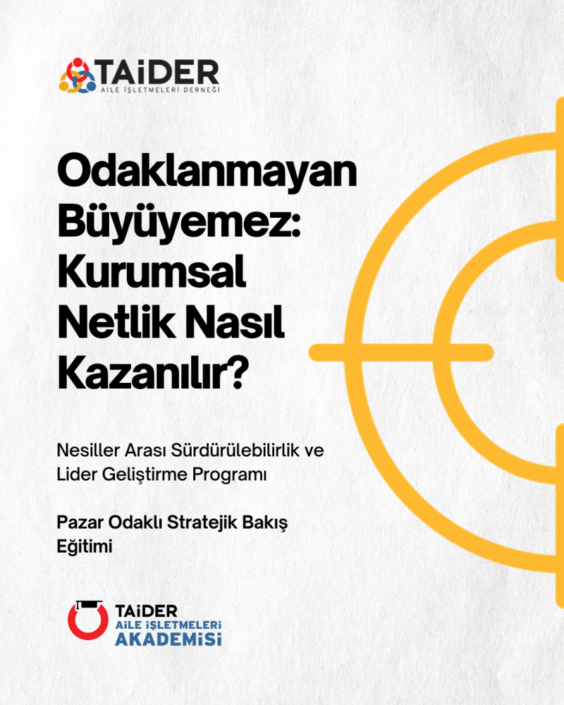 TAİDER Akademi’nin Nesiller Arası Sürdürülebilirlik ve Liderlik Geliştirme Programı kapsamında düzenlenen 6 eğitimlik serinin ilk oturumu “Pazar Odaklı Stratejik Bakış” eğitimi, 17 Ocak 2026 Cumartesi günü 09.30 – 19.00 saatleri arasında İstanbul Divan Koç Pera’da gerçekleşecek.