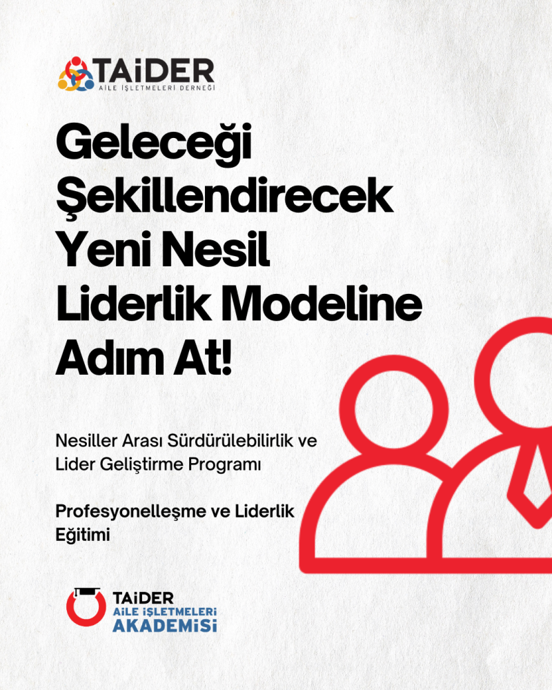 TAİDER Akademi’nin Nesiller Arası Sürdürülebilirlik ve Liderlik Geliştirme Programı kapsamında düzenlenen 6 eğitimlik serinin ikinci oturumu “Profesyonelleşme ve Liderlik” eğitimi, 07 Şubat 2026 Cumartesi günü 09.30 – 19.00 saatleri arasında İstanbul Farklabs’te gerçekleşecek.