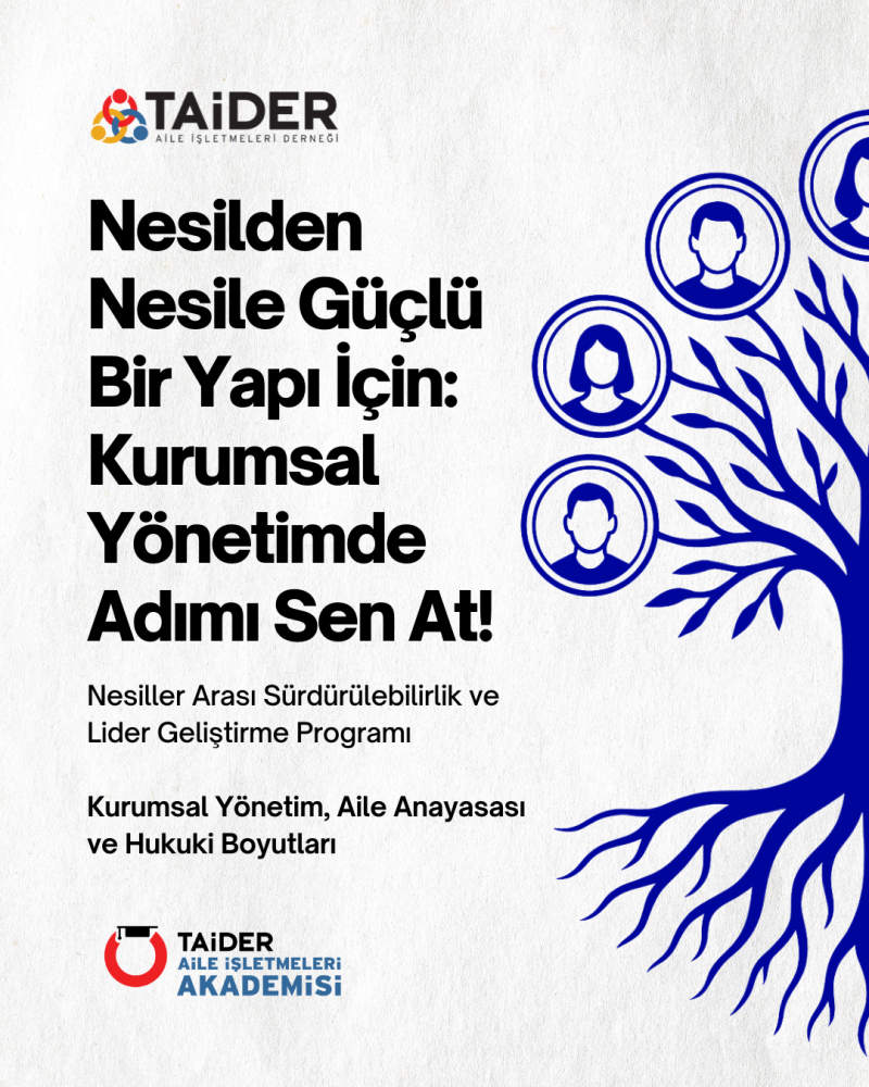 TAİDER Akademi’nin Nesiller Arası Sürdürülebilirlik ve Liderlik Geliştirme Programı kapsamında düzenlenen 6 eğitimlik serinin dördüncü oturumu “Kurumsal Yönetim, Aile Anayasası ve Hukuki Boyutları ” eğitimi, 11 Nisan 2026 Cumartesi günü 09.30 – 19.00 saatleri arasında İzmir Workinton’da gerçekleşecek.