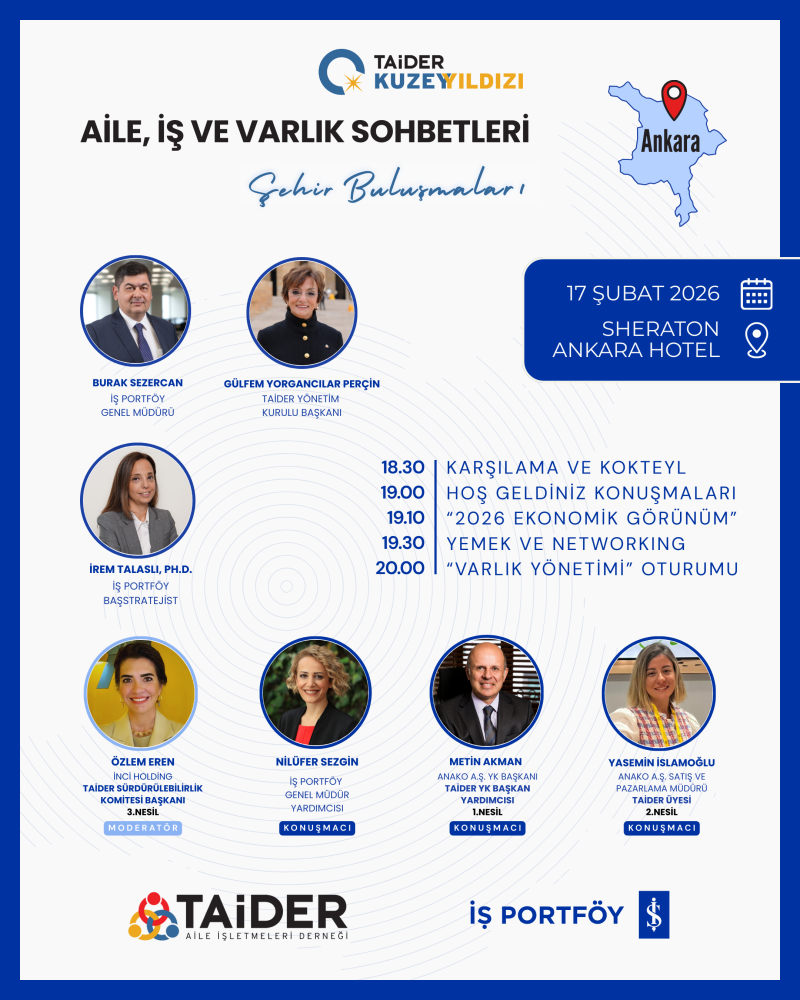 “Aile, İş ve Varlık Sohbetleri" başlığı altında düzenlenecek etkinlikte katılımcılarımız Makroekonomi, Sürdürülebilir Finansman ve Yatırım Araçları hakkında uzman görüşleri dinleme fırsatı bulurken, TAİDER Kuzey Yıldızı Aile Şirketlerinde Sürdürülebilirlik Programı'nı deneyimlemiş bir aile şirketinin gerçek hikayesini de öğrenebilecek.