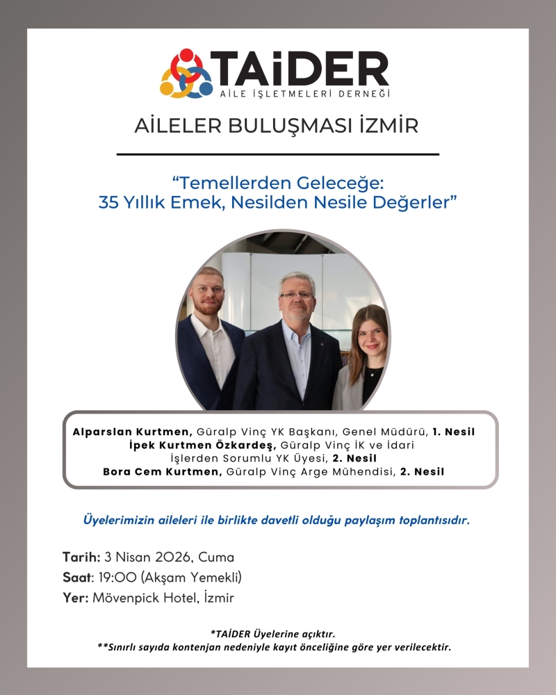 TAİDER İzmir İl Temsilciliği tarafından planlanan etkinliğimizde, Güralp Vinç Ailesi'ni ağırlayacak ve "Temellerden Geleceğe: 35 Yıllık Emek, Nesilden Nesile Değerler'' konu başlığında aile şirketi hikayelerini dinleyeceğiz.